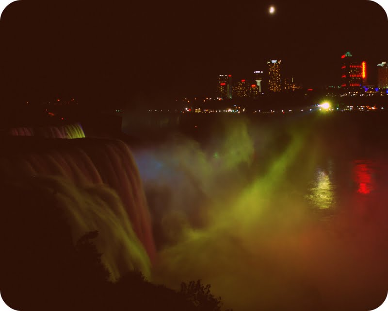 niagara falls at night is beautiful! since the falls are on the united states side, they shine lights from the canada side to illuminate them in the night sky. it was hard to get a decent picture that really does them justice without our tripod, but they were really incredible.